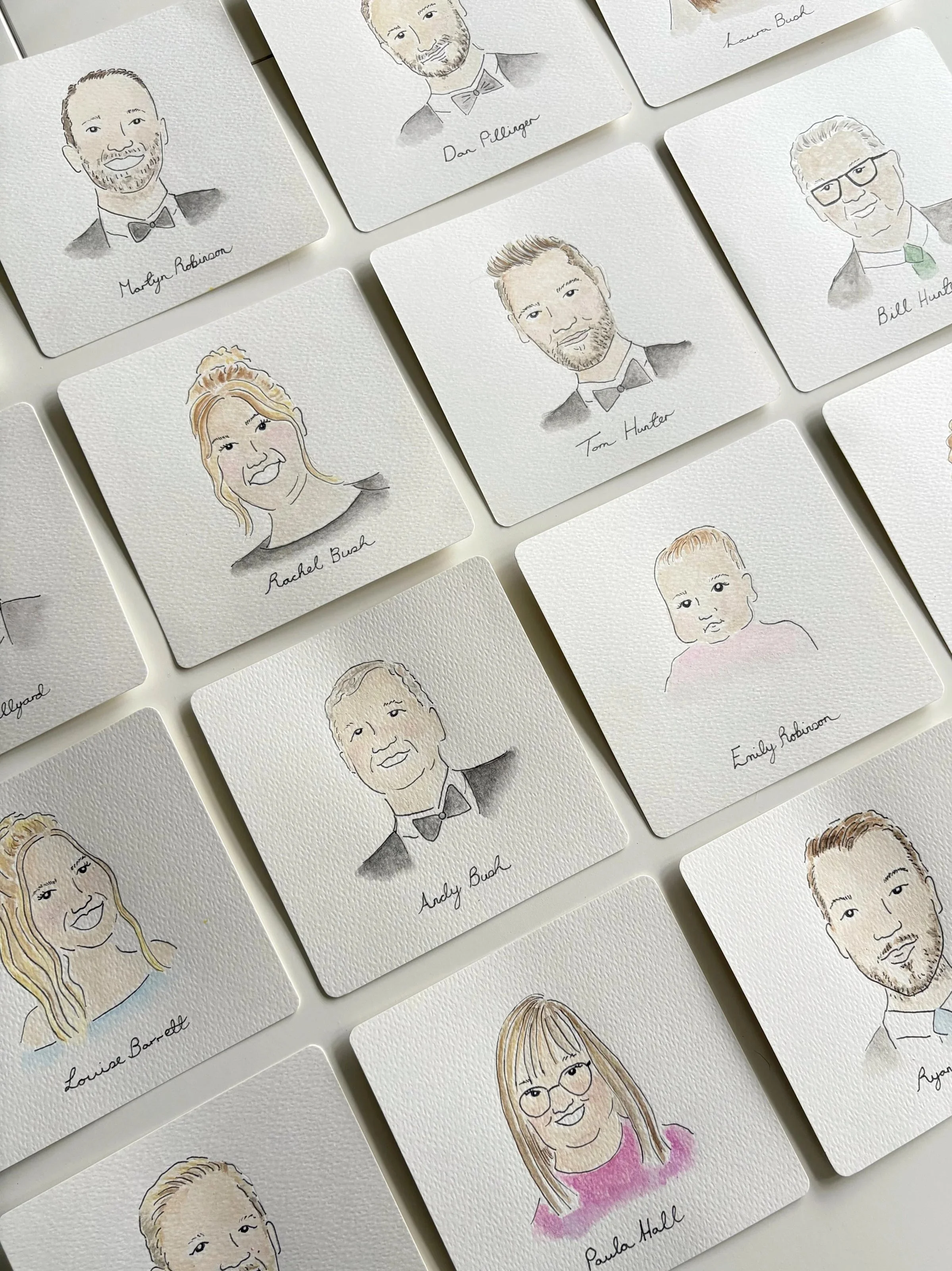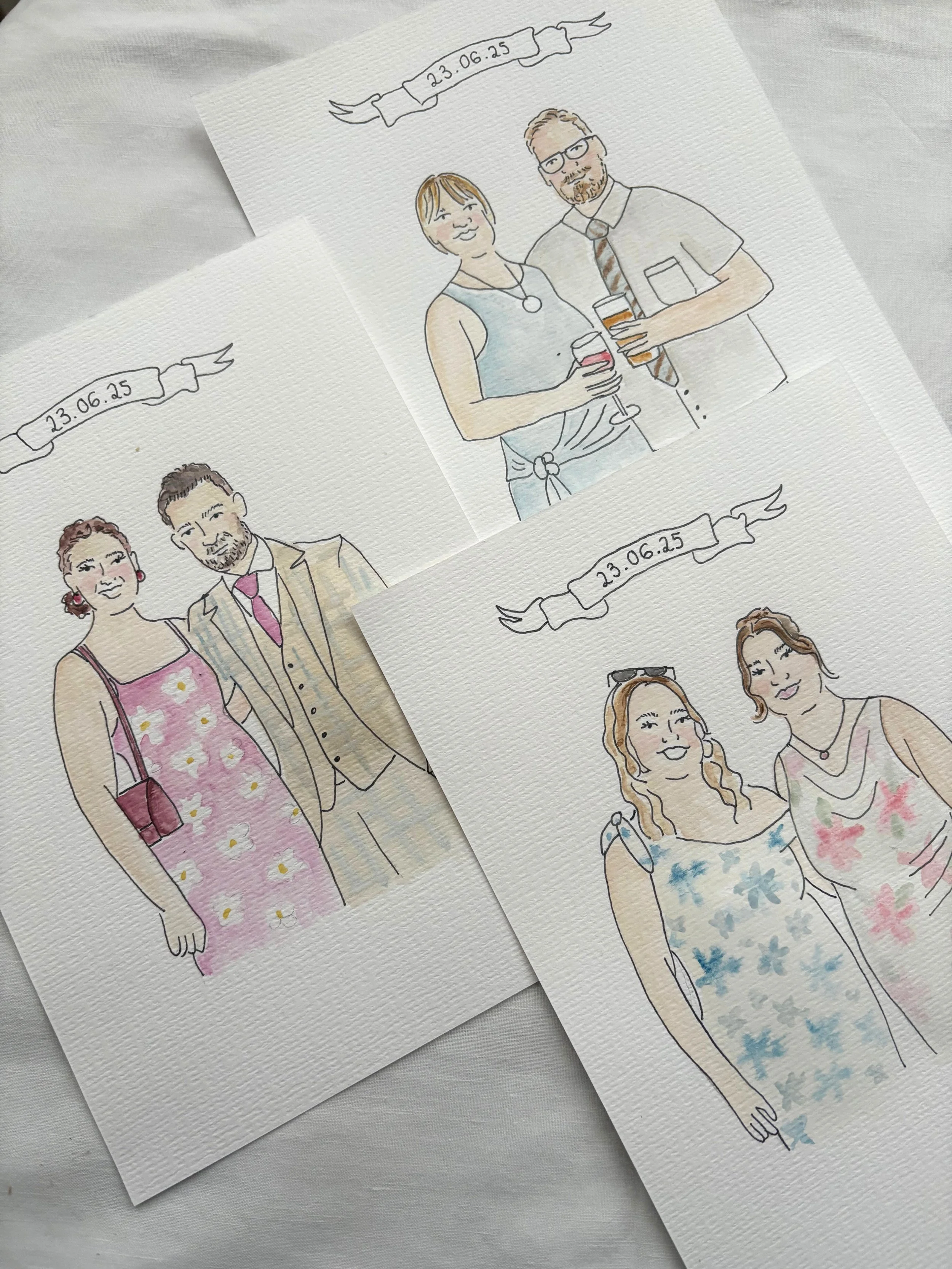 II use watercolour paint, which dries quickly, so your guests can take their portraits home the same day, no smudging or waiting around!